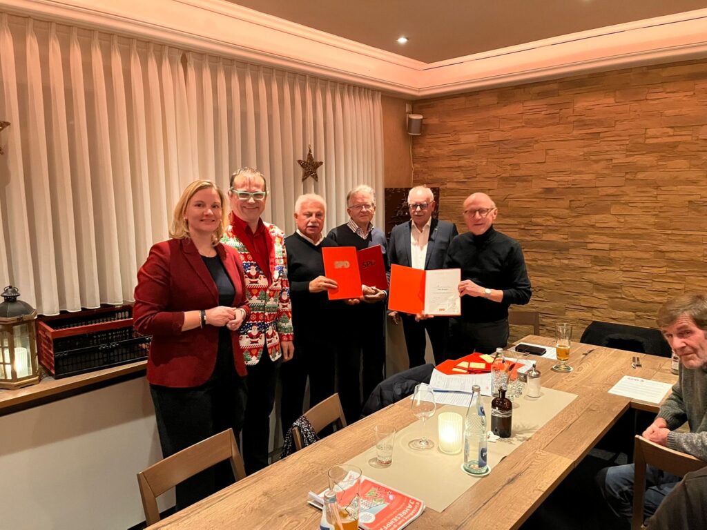 Freudenstadt/Loßburg-Lombach. Gut aufgehoben fühlte sich der SPD-Ortsverein Freudenstadt/Oberes Wolftal mit seiner Adventsfeier bei Familie Stein in der „Linde“ in Loßburg-Lombach. Neben ein wenig Politik aus Stadt, Kreis, Land und Bund nutzten die Genossen die Gelegenheit zum geselligen Austausch bei gutem Essen und Unterhaltungsmusik von Carlo Parisel, um treue Mitglieder auszuzeichnen. Dies galt an erster Stelle für Nils Krieger aus Freudenstadt, der seit einem halben Jahrhundert der Sozialdemokratie angehört und sich dort, wie auch in anderen Vereinen oder als Stadtführer für die Gesellschaft engagiert. Seit 25 Jahren ist Hartmut Schneider Mitglied bei den Sozialdemokraten. Er war viele Jahre auch Vorsitzender des Ortsvereins, so wie es heute Sadik Varol ist, ebenfalls seit 25 Jahren in der SPD. Ihnen allen gratulierte Kreisvorsitzender Marius Thoy mit herzlichen Worten ebenso wie SPD-Landtagskandidatin Bettina Ahrens-Diez, die auf das aktuellen Programm zur Landtagswahl im März 2026 einging. Unter dem Motto „Weil es um Dich geht“ stellt die Landes-SPD die Themen Bildung, Wohnen, Wirtschaft und starke Kommunen in den Mittelpunkt, führte Ahrens-Diez aus.